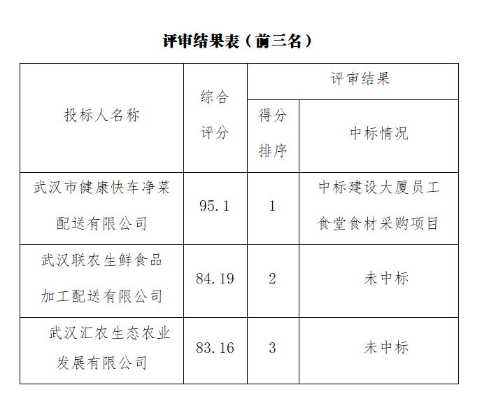? ? 經評審,綜合評分排名第一為武漢市健康快車凈菜配送有限公司,綜合評分為95.1分,中標武漢市政工程設計研究院有限責任公司建設大廈員工食堂食材采購項目。