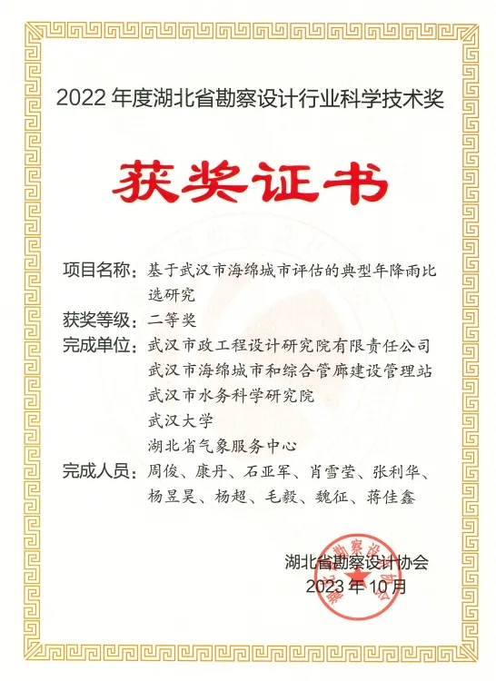 依托“城市內(nèi)澇防治與水環(huán)境流域治理技術(shù)中試平臺(tái)”開(kāi)展的《基于武漢市海綿城市評(píng)估的典型年降雨比選研究》獲湖北省勘察設(shè)計(jì)協(xié)會(huì)科學(xué)技術(shù)二等獎(jiǎng)