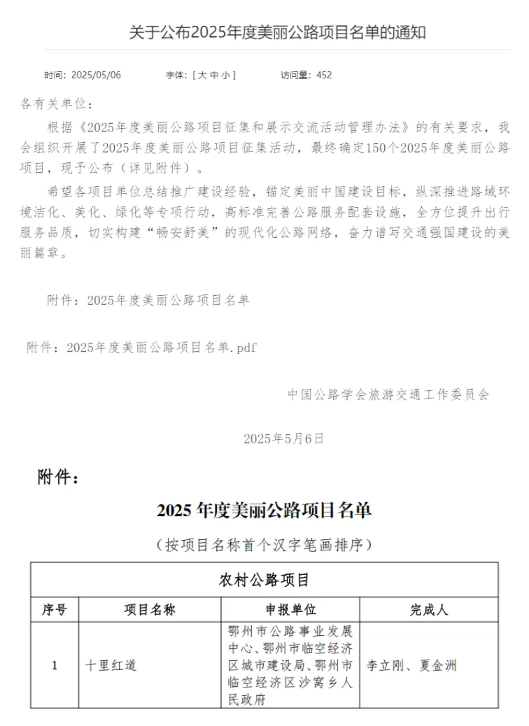 ? ? 近日,中國公路學(xué)會(huì)正式公布“2025年度美麗公路項(xiàng)目”名單,武漢市政院設(shè)計(jì)的鄂州市臨空經(jīng)濟(jì)區(qū)沙窩鄉(xiāng)“十里紅道”憑借紅色文化傳承與生態(tài)環(huán)境融合的卓越理念,成功躋身全國150個(gè)標(biāo)桿項(xiàng)目之列。