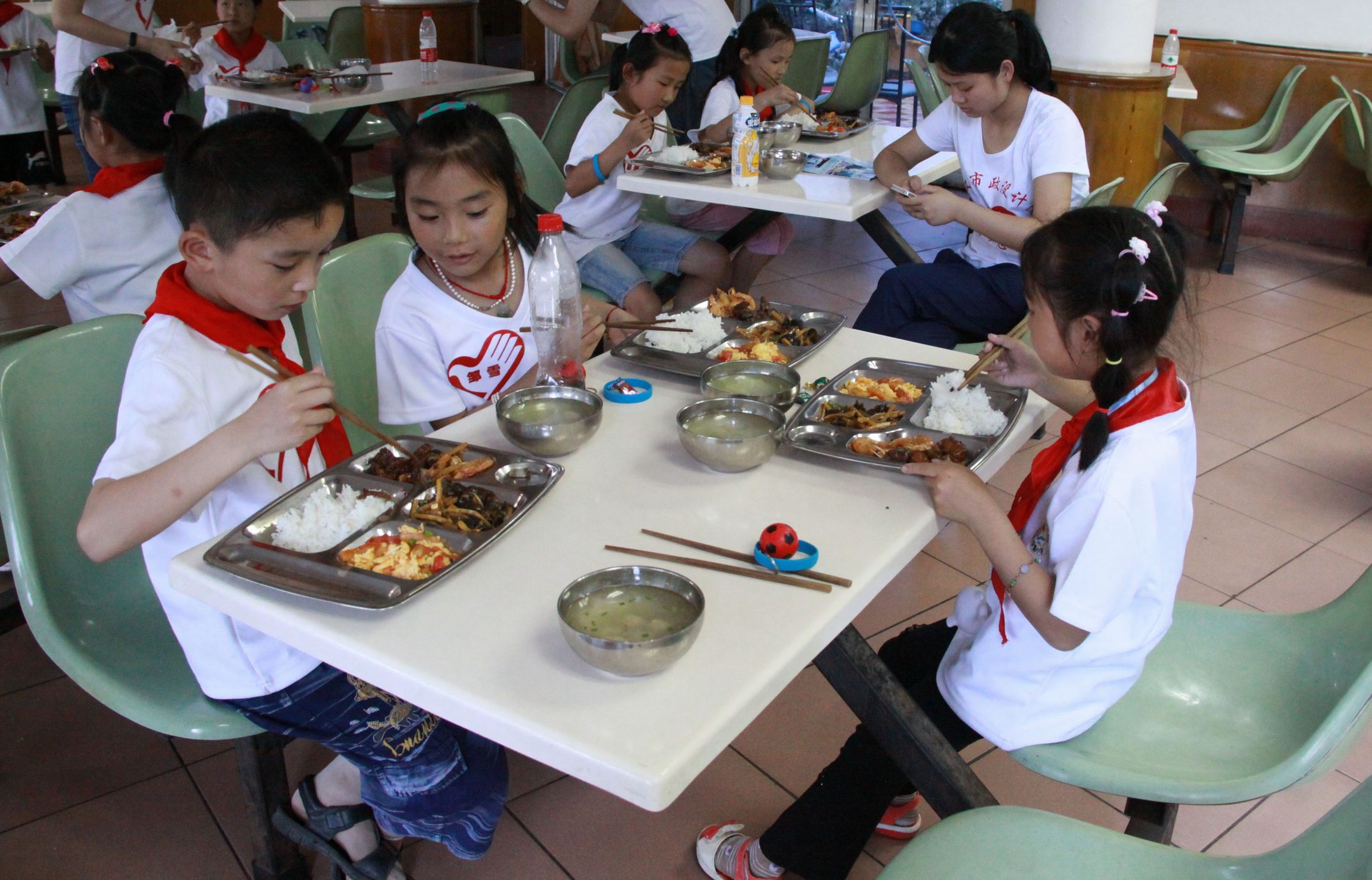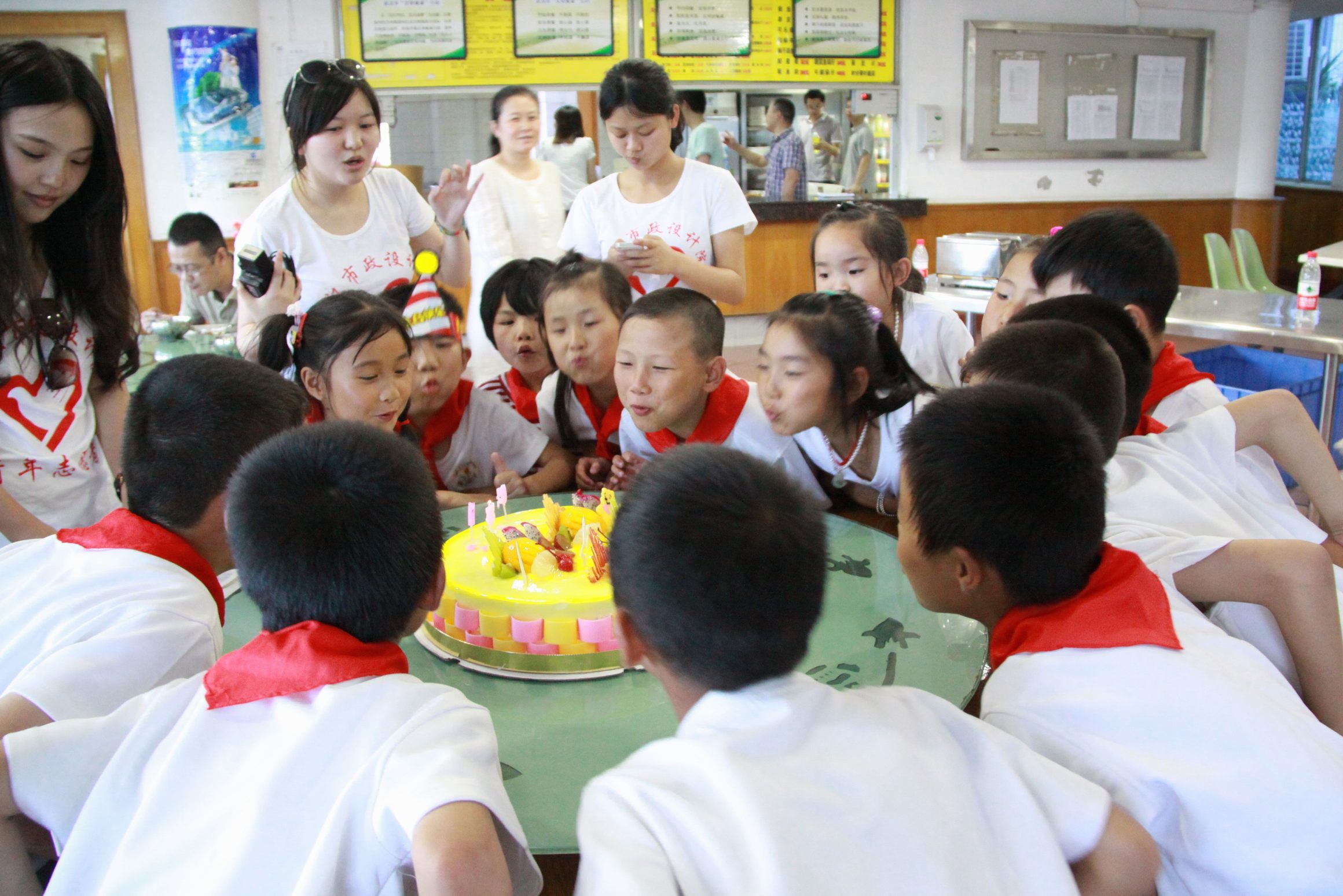 ??? 結(jié)束了一天的行程,志愿者與孩子們回到公司吃晚飯,孩子們有秩序的排隊(duì)領(lǐng)取晚餐,吃的干干凈凈。這時(shí),志愿者們端出了準(zhǔn)備好的蛋糕,為這群7-9歲的孩子們過(guò)一個(gè)集體生日,大家唱著生日歌,一起吹滅了蠟燭。志愿者們將蛋糕分發(fā)給每一個(gè)孩子,他們吃的津津有味。