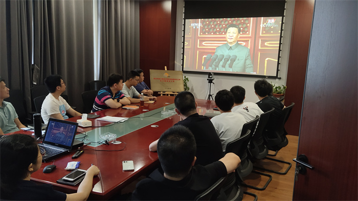 公司領(lǐng)導(dǎo)、總經(jīng)理助理、駐總院辦公的部門負(fù)責(zé)人、支部書記在西四樓會(huì)議室集中收看大會(huì)盛況。大會(huì)伊始,在轟鳴的禮炮聲中,國旗護(hù)衛(wèi)隊(duì)護(hù)衛(wèi)國旗颯爽登場(chǎng);全場(chǎng)肅立高唱《國歌》,高亢的旋律瞬間營造了莊嚴(yán)肅穆的氛圍;少先隊(duì)員和共青團(tuán)聯(lián)合獻(xiàn)詞,回顧黨的光輝歷史,表達(dá)對(duì)黨的熱愛與忠誠。大會(huì)現(xiàn)場(chǎng)氣氛莊嚴(yán),激昂奮進(jìn),讓收看的人仿佛置身現(xiàn)場(chǎng),親臨盛典。