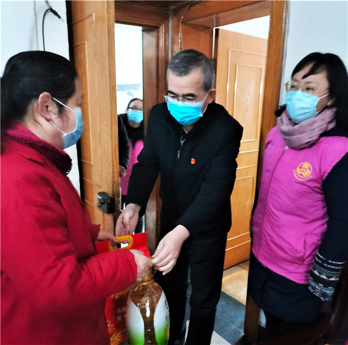 慰問(wèn)期間,恰逢社區(qū)正在開展“臘八送福·甜蜜相伴”活動(dòng),談逢陽(yáng)一行也加入其中,熱情地為前來(lái)的社區(qū)居民發(fā)放臘八米,送上殷切的節(jié)日祝福,叮囑他們要做好防護(hù)。