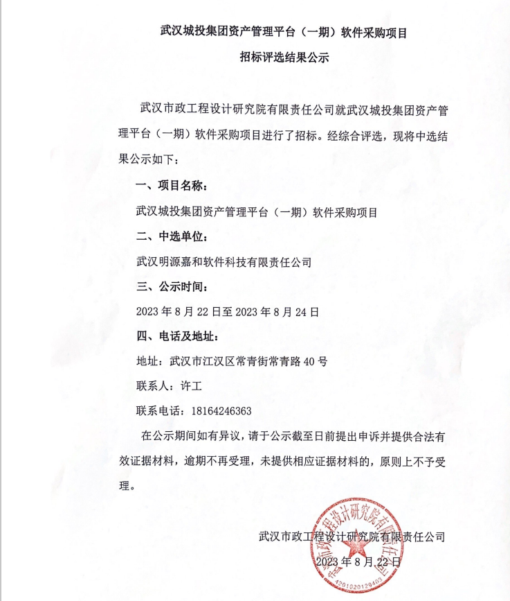 武漢城投集團(tuán)資產(chǎn)管理平臺(tái)(一期)軟件采購(gòu)項(xiàng)目招標(biāo)評(píng)選結(jié)果公示